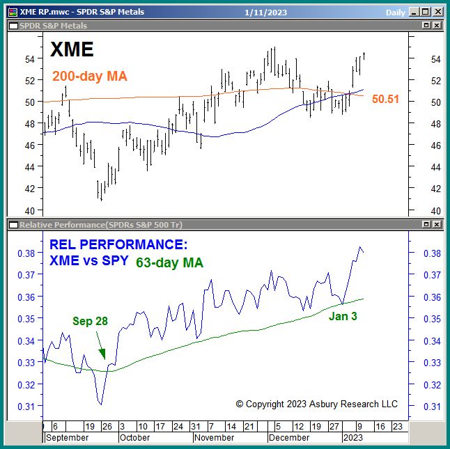 The upper panel of Chart 1 below plots the SPDR S&P Metals and Mining ETF (XME) daily since September, along with its 50- and 200-day moving averages, widely-watched minor and major trend proxies. The lower panel plots the corresponding daily relative performance of XME versus the SPDR S&P 500 ETF Trust (SPY) along with its 63-day moving average.