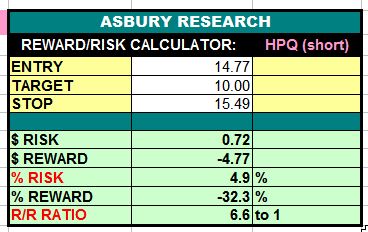 HP Inc. (HPQ) appears to be resuming its February decline following about 6 weeks of sideways investor decision. A sustained decline below the $15.49 area would help confirm this and target an additional 32% decline to $10.00 per share. This is an Asbury Momentum idea.
