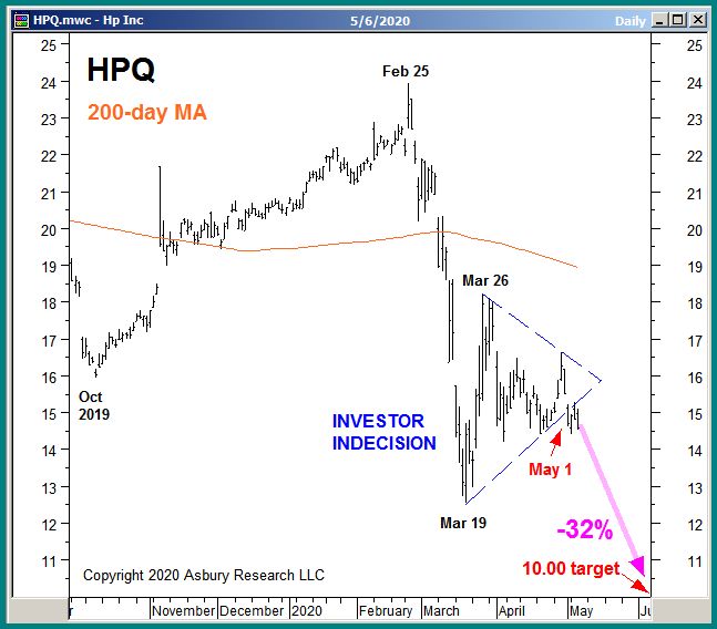 Chart 1 below plots HPQ daily since Q4 2019 and shows that price is currently breaking down lower from about 6 weeks of sideways price activity that is indicative of investor indecision. This recent breakdown suggests the larger late February decline in HPQ is resuming and targets an additional 32% decline to $10.00 per share. This downside target will remain valid as long as the upper boundary of the indecision area, currently situated near $15.40, now loosely contains as overhead resistance.