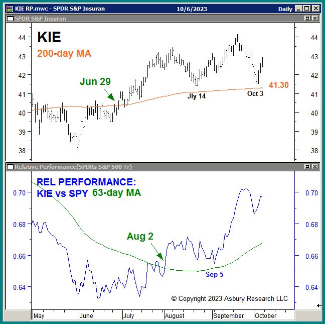 The green highlights in the upper panel show that KIE is in the midst of a Jun 29th major uptrend that was successfully tested on Jly 14th and Oct 3rd. The lower panel shows that KIE is also in an Aug 2nd trend of Strategic relative outperformance versus SPY, which was successfully tested on Sep 5th.