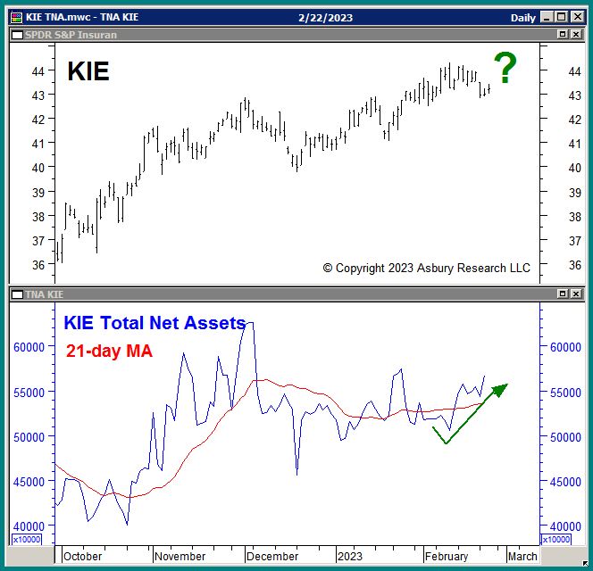 The lower panel of Chart 2 below plots the daily total net assets invested in KIE since October along with their 21-day moving average, which we use to identify a monthly trend of expansion or contraction. The green arrow points out that these assets appear to be resuming their October 2022 trend of monthly expansion following months of sideways, directionless movement. Expanding assets are the fuel that drives a positive price trend.