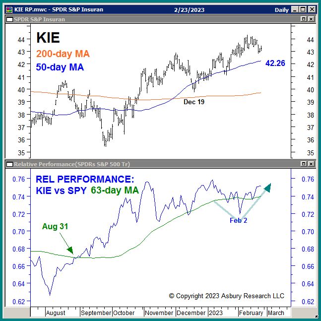 The upper panel shows that KIE has been above its 200- and 50-day moving averages since October to indicate positive minor and major trends, and that these trends were tested and successfully held on Dec 19th. The lower panel shows that KIE appears to be resuming its October 2022 trend of Strategic, quarterly relative outperformance versus the S&P 500 (SPY).