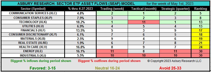 Meanwhile, our SEAF Model atypically underperformed the S&P 500 in the 1st Quarter after significantly outperforming the benchmark index in eight of the previous ten quarters. This indecision according to SEAF can be seen in both the length of the individual SEAF signals and the rapidly changing nature of the signals. This means something. In 2022, the average length of a SEAF buy/overweight signal was approximately 6 to 7 weeks. During the first quarter of this year, however, the average signal length was just 2 to 3 weeks. Moreover, the changes from SEAF signal to SEAF signal during Q1 were atypically very erratic — often shifting from an offensive, “risk on” sector like Technology to a defensive “risk off” one like Utilities 2 weeks later.