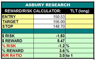 The iShares 20+ Year Treasury Bond ETF (TLT, which moves inversely to the yield of the 10-Year TReasury Note) is amid favorable conditions to continue its recent price advance amid relative outperformance versus the S&P 500 (SPX). A sustained rise above the 148.70 area would target an additional 3.6% rise to 156.00. This is an Asbury Momentum idea, and a potential hedge against an emerging US stock market decline.