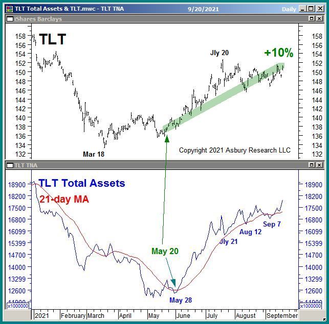 Chart 2 below again plots TLT daily since January in the upper panel, this time with the corresponding total net assets invested in TLT and their 21-day MA plotted in the lower panel.