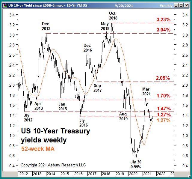 Chart 3 below plots the yield of the 10-Year Treasury Note weekly over the past decade along with its 52-week moving average. The chart shows that these yields tested and failed at 1.70% overhead resistance in March, just as TLT was bottoming as shown in the upper panel of Chart 2 above.