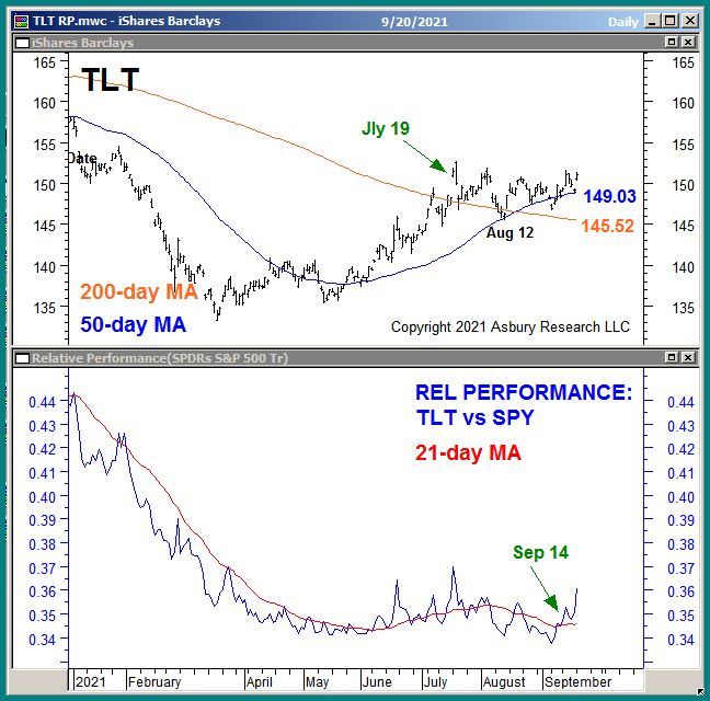 The upper panel of Chart 1 below plots TLT daily since January and shows that it moved above its 200-day moving average (major trend proxy) as of Jly 19th and has remained above it since, while now recognizing it as underlying support as it did on Aug 12th.