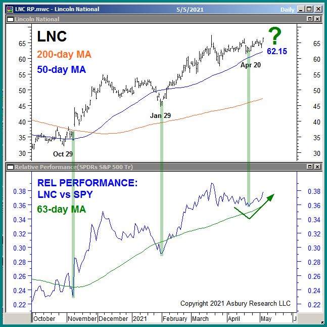 The rightmost green highlights in the upper panel show that LNC appears to be resuming its November 2020 major uptrend, as defined by its 200-day MA, following its Apr 20th test of the 50-day MA. Meanwhile, LNC’s trend of Strategic relative outperformance versus SPX as shown in the lower panel also appears to be resuming. The other green highlights show that similar tests of the Strategic relative outperformance trend on Jan 29th and Oct 29th also resulted in the resumption of the positive trends in both panels. A sustained rise above the 50-day MA, currently situated at $62.15, would help to confirm the outright uptrend has resumed and would target an additional 20% rise to $80.00 per share.