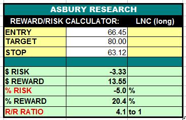 Lincoln National Corporation (LNC) appears to be resuming its November 2020 major uptrend amid coincident quarterly relative outperformance versus the benchmark S&P 500 (SPX). A sustained rise above the $62.15 area would help confirm this and would target an additional 20% rise to $80.00 per share. This is an Asbury Momentum trade idea.