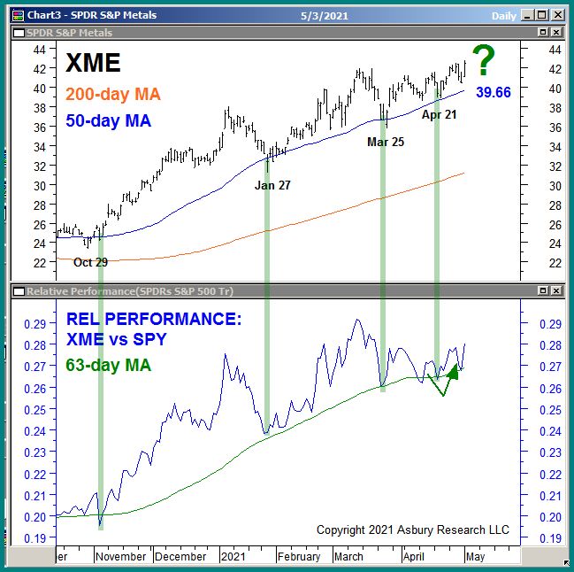 The upper panel of Chart 1 below plots XME daily since October 2020 along with its 200- and 50-day moving averages, widely-watched major and minor trend proxies. The lower panel displays a corresponding daily relative performance chart of XME versus the benchmark S&P 500 (SPX, blue) along with its 63-day moving average (green, quarterly, our Strategic time period).