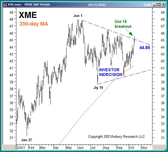 The green highlights in Chart 1 below show that XME is currently breaking out higher from 3 1/2 months of sideways investor indecision. This suggests its larger August 2020 Strategic advance is resuming and targets an additional 18% rise to 53.20 that will remain valid as long as the upper boundary of the indecision area, currently at 44.85, now contains as underlying support.