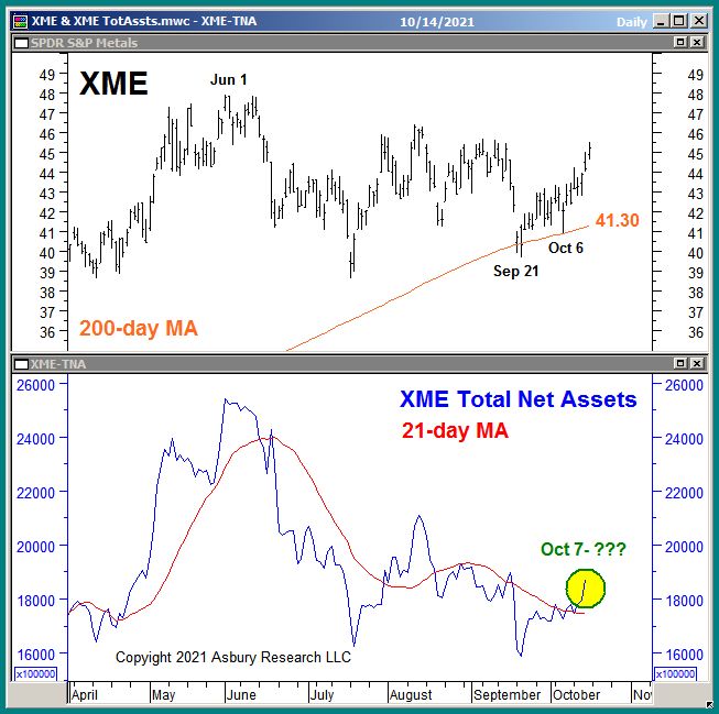 Chart 2 below plots XME daily since April with its 200-day moving average (major trend proxy) in the upper panel, with a corresponding chart of the daily total net assets invested in XME and their 21-day (one business month, our Tactical time period) moving average in the lower panel.