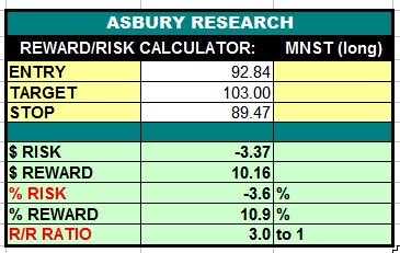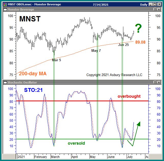 The rightmost green highlights in Chart 1 below show that MNST is currently rebounding from a Jun 25th test of its 200-day moving average, a widely-watched major trend proxy currently at $89.08 (upper panel) while rebounding from monthly (our Tactical time period) oversold extremes (lower panel). The other green highlights show that similar conditions closely coincided with Tactical bottoms in early May and in early March. These conditions set up a low-risk opportunity to buy an uptrending stock in a potentially low-risk/high reward environment just above major support. If the current major uptrend in MNST is still valid, this is where it should resume.