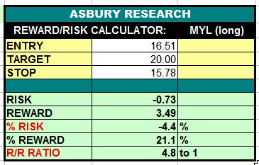Mylan N.V. (MYL) is currently breaking out higher from 6 weeks of sideways investor indecision. A sustained rise above the upper boundary of this indecision area, currently at $16.14, would confirm the breakout and target an additional 21% rise to $20.00 per share. This is an Asbury Momentum idea.