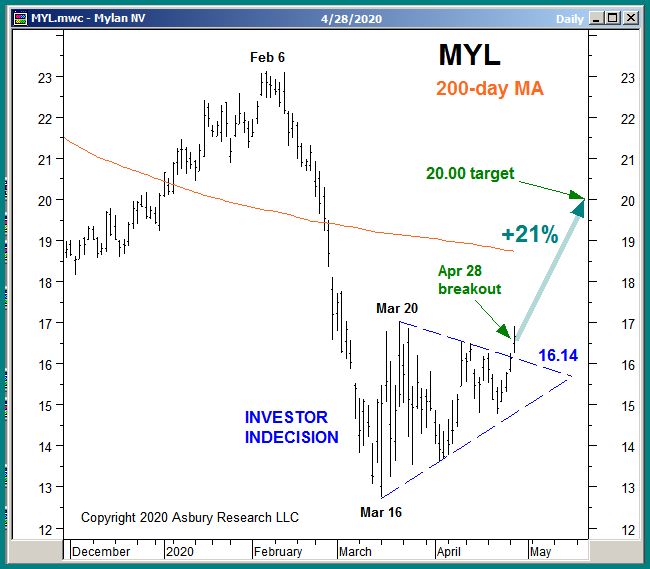 Chart 1 below plots MYL daily since December 2019 along with its 200-day moving average, a widely-watched major trend proxy. The green highlights show that the stock is currently breaking out higher from about 6 weeks of sideways investor indecision from the mid March lows. A sustained rise above the upper boundary of this indecision area, currently at $16.14, would confirm the breakout and target an additional 21% rise to $20.00 per share.