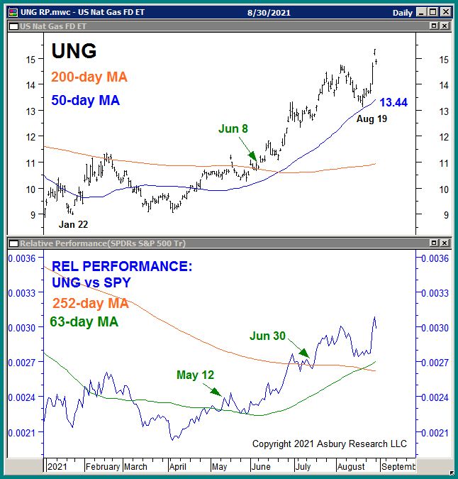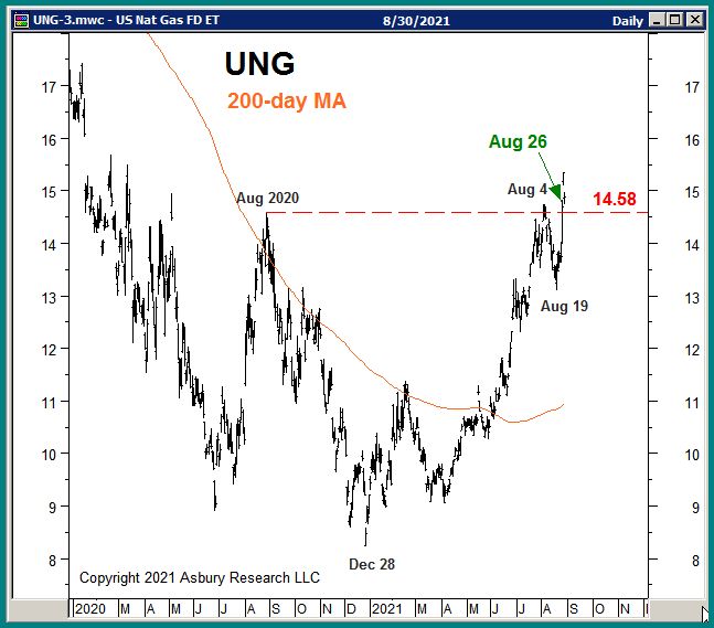 The green highlights in Chart 1 below show that UNG has risen above its $14.58 August 2020 benchmark high as of Aug 26th after first testing and failing at that level on Aug 4th.