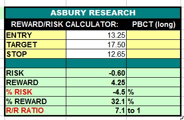 Chart 1 below plots PBCT daily since Q4 2019 and shows that price is currently breaking out higher from months of sideways investor indecision from the April lows. A sustained rise above the upper boundary of the indecision area, currently near $13.04, would target an eventual, additional 32% rise to $17.50 per share.