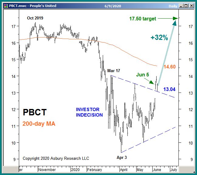 People’s United Financial (PBCT) appears to be resuming its April advance following months of sideways investor indecision. A sustained rise above the upper boundary of the indecision area, currently near $13.04, would target an additional 32% rise to $17.50 per share.