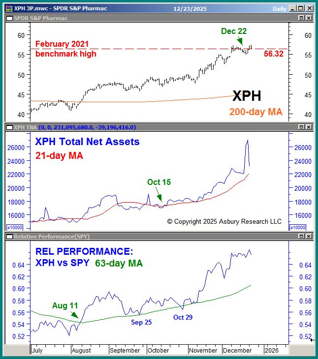 The green highlights in the upper panel of Chart 1 below show that the State Street SPDR S&P Pharmaceuticals ETF (XPH) is currently breaking major overhead resistance at 56.32, the November 2021 benchmark high. The middle panel shows that the total net assets invested in XPH (AUM) are currently in an Oct 15th trend of monthly expansion. Expanding assets are characteristic of sustainable price advances. The lower panel shows that XPH is in the midst of an Aug 11th trend of quarterly relative outperformance versus the S&P 500 (SPY).