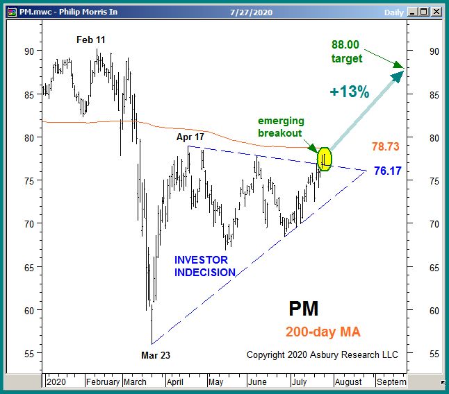 An emerging bullish breakout from months of sideways investor indecision in Philip Morris International Inc. (PM) targets an additional 13% rise to $88.00 per share.