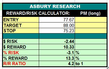 Chart 1 below plots PM daily since January. The green highlights point out an emerging bullish breakout from four months of sideways indecision from the March 23rd low. A sustained rise above the upper boundary of the indecision area at $76.17 would target an additional 13% rise to $88.00 per share and would be further confirmed by a rise above the 200-day moving average, a widely-watched major trend proxy currently situated at $78.73.