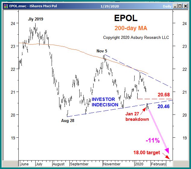 The iShares MSCI Poland ETF (EPOL) appears to be resuming its July 2019 decline following 5 months of sideways investor decision. A sustained decline below the 20.46 area would help confirm this and target an additional 11% decline to 18.00. This is an Asbury Momentum idea.