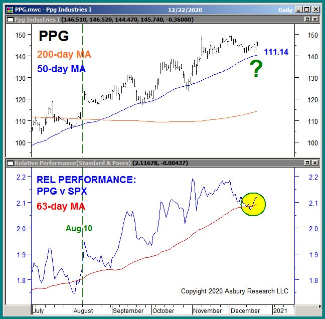 The upper panel of Chart 1 below plots PPG daily since July in the upper panel along with its 200- and 50-day day moving averages, widely-watched major and minor trend proxies. In the lower panel, there is an accompanying chart of PPG’s relative performance versus the S&P 500 (SPX) and its 63-day (quarterly, our Strategic time frame) moving average.