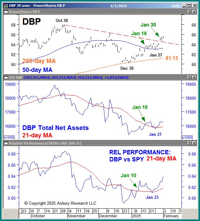 The upper panel of Chart 1 below shows that the Invesco DB Precious Metals Fund (DBP) is in the midst of major and minor uptrends, according to its 200- and 50-day moving averages, and has recently risen above its Oct 30th downtrend line.  The middle panel shows that the total net assets invested in DBP (AUM) have been expanding on a 21-day monthly basis since Jan 16th.  Expanding assets indicate bullish conviction in higher prices.  The lower panel shows that DBP has been outperforming the S&P 500 on a 63-day quarterly basis since Jan 10th.
