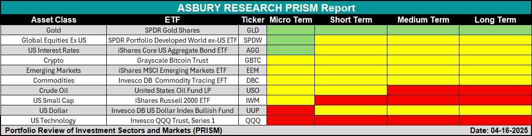 Introducing the PRISM Report—an internal tool we use to track broad market trends across four distinct time frames, ranging from the Micro Term Trend to the Long Term Trend. As shown in the table below, the only broad asset class performing well across all four time frames is Gold (GLD), which Asbury has been in and out of since Jan 31st. (Asbury ETF Trade Ideas – Asbury Research).
