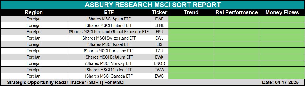 The MSCI SORT Report is a strategic tool we use when global markets begin to outperform. It helps identify where capital is flowing on a country-by-country basis. This table evaluates 40 countries and territories, measuring each for positive price trend, relative outperformance versus the S&P 500, and expanding asset flows.