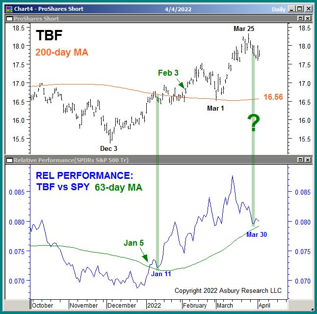 The upper panel of Chart 1 below plots TBF daily since October 2021 along with its 200-day moving average, a widely-watched major trend proxy. The lower panel plots the daily relative performance of TBF versus the SPDR S&P 500 ETF (SPY) along with its 63-day (quarterly) moving average, the latter which we use to identify the Strategic trend of relative performance versus the US broad market.