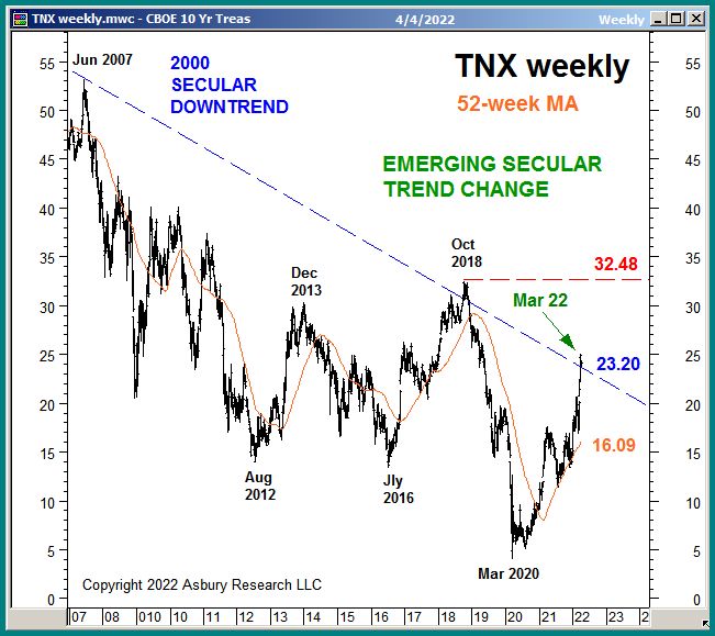 Chart 2 below plots the CBOE Treasury Yield 10 Year Index (TNX) weekly since 2007, which tracks the yield of the US 10-Year Treasury Note. The green highlights show that TNX has recently risen above its 2000 secular downtrend line, which suggests this 22-year trend of declining long term US interest rates has ended and a new positive long term trend is emerging.