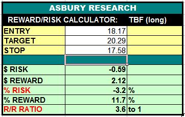Table 1 below shows that considering a 20.29 upside target in TBF with a protective stop placed below the 17.58 area, a long entry price of 18.17 would provide a 1:3.6 risk/reward ratio (risking $1.00 to make $3.60) with an initial risk of 3.2%.