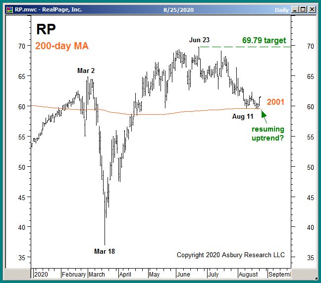 RealPage, Inc. (RP) appears to be resuming its March advance following a 15% correction from the June highs. A sustained rise above the $59.62 area would help confirm this and target a 13% rise to $69.79. This is an Asbury Value idea.