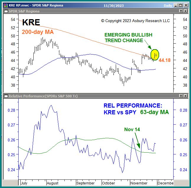 The colored highlights in the upper panel show that KRE is currently edging above its 200-day MA to suggest an emerging major bullish trend change. The green highlights in the lower panel show that KRE is also in an emerging quarterly trend of relative outperformance versus SPY.