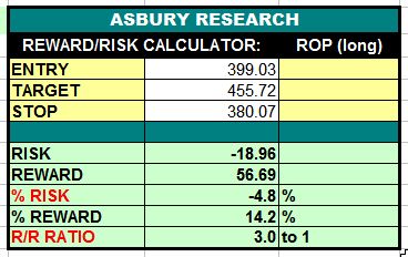 Table 1 below shows that considering the aforementioned upside target and a protective stop placed below the $380.07 area, a long entry price of $399.03 would provide a 1:3.0 risk/reward ratio (risking $1.00 to make $3.00) with an initial risk of 4.8%.