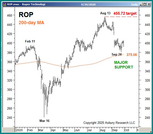 Chart 1 below plots ROP daily since January, highlighting its late September test of major underlying support at its 200-day moving average following a 17% corrective decline from the Aug 13th high. Not shown is that a number of market internals are starting to improve as ROP has been testing this major support, currently at $375.06, over the past week.