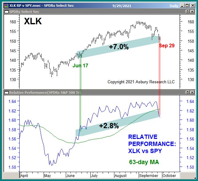 XLK daily since Ap[ril with relative performance versus the S&P 500