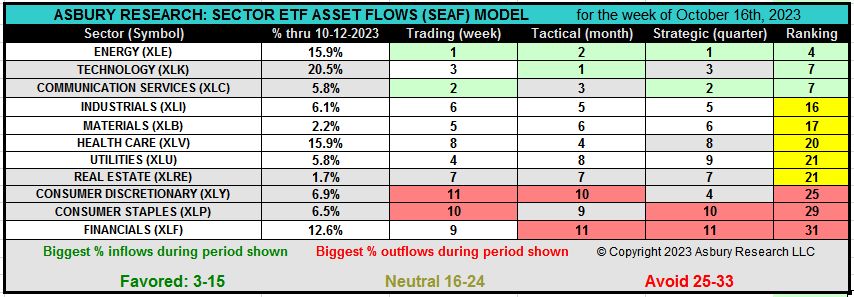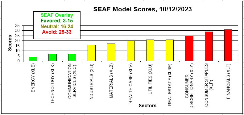 The SEAF Model Scores chart below displays the rankings shown in the graphic above according to Favored (score of 1-15, green), Neutral (score of 16-24, yellow), and Avoid (score of 25-33, red) sectors. On this chart, the SEAF Model Overlay signals are highlighted in a brighter shade of green.