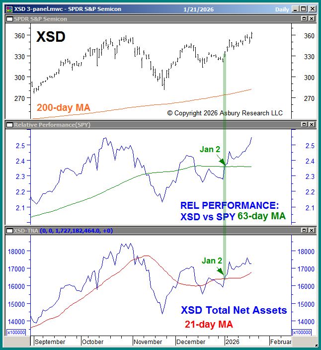 The upper panel of Chart 1 below shows that the SPDR S&P Semiconductor ETF (XSD) is currently making new all-time highs after breaking out from two months of sideways investor indecision on Jan 6th. This breakout targets an additional 12% rise to 410 that will remain valid above 338.48. The middle panel shows that the XSD is in a Jan 2nd trend of quarterly relative outperformance versus the S&P 500 (SPY). The low panel shows that the total net assets invested in XSD (AUM) is Jan 2nd trend of monthly expansion. Expanding assets are characteristic of sustainable price advances.