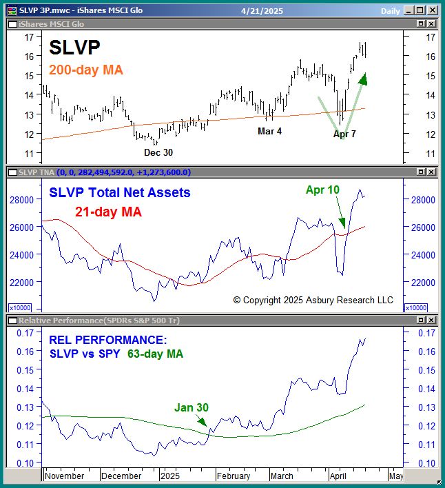 The upper panel of Chart 1 below shows that the iShares MSCI Global Silver and Metals Miners ETF (SLVP) has, with few exceptions, been above its 200-day moving average since November 2024 to indicate a major uptrend. Not shown is that this major uptrend was initiated in March 2024. The middle panel shows that the total net assets invested in SLVP (AUM) moved back above their 21-day moving average on Apr 10th to indicate a monthly trend of expanding assets that is characteristic of sustainable bullish Tactical price advances. The lower panel shows that SLVP has been outperforming the S&P 500 on a 63-day quarterly basis since Jan 30th.