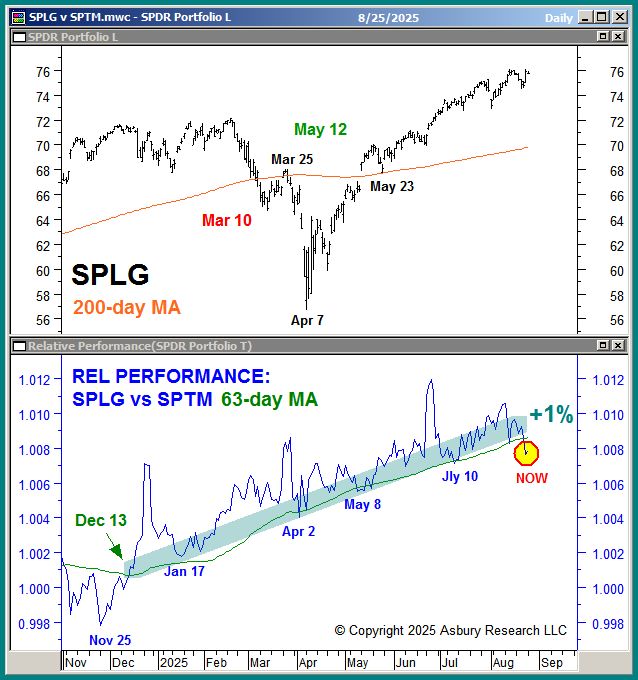 We exited our Dec 13th 2024 overweight in the SPDR Portfolio Large Cap ETF (SPLG) today, which has outperformed the SPTM Portfolio Total Stock Market ETF (SPTM) by 1.0% during this period as shown in the chart below.