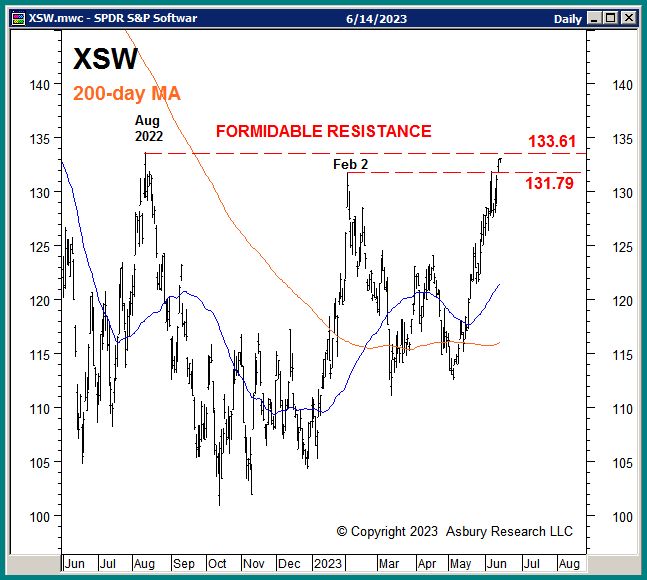 We are exiting our June 1st long idea in the the SPDR S&P Software & Services ETF this afternoon as it is testing formidable overhead resistance at  131.79 to 133.61.