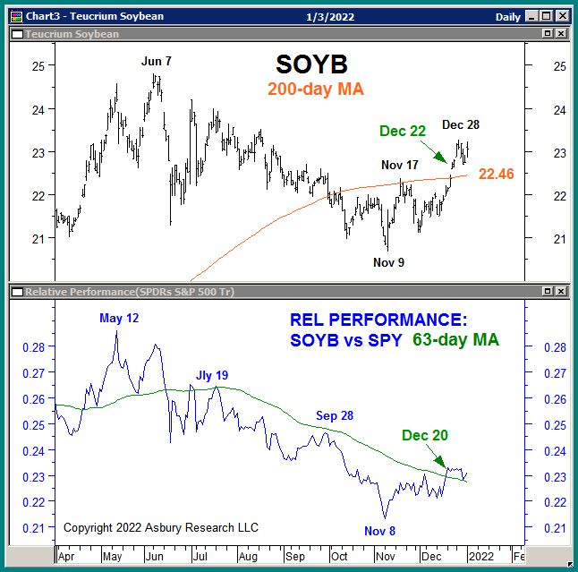 The green highlights in the upper panel of Chart 1 below point out that SOYB rose and has remained above its 200-day moving average as of Dec 20th, indicating an emerging major bullish trend change. The green highlights in the lower panel of Chart 1 below point out that the blue daily relative performance line of SOYB versus the SPDR S&P 500 ETF (SPY) rose above its 63-day (quarterly, our Strategic time period) moving average on Dec 20th, indicating an emerging trend of Strategic relative outperformance versus the US stock market, and is now retesting it as underlying support.
