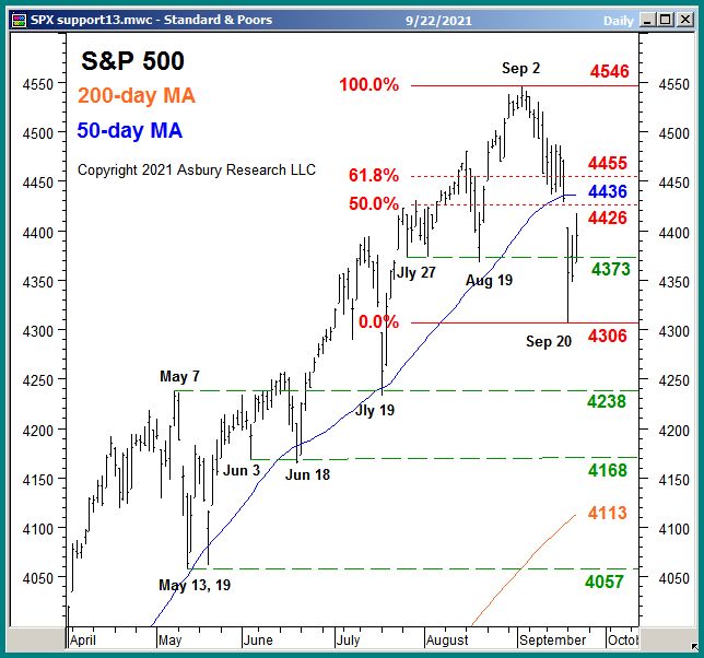 The benchmark S&P 500 (SPX) will begin today’s session situated just below Tactical overhead resistance at 4426 to 4455.  This is where the current downside correction in SPX, based on our Asbury 6 and Correction Protection Model (CPM), should resume if still valid.  A sustained move above this resistance area, accompanied by a shift back to Positive / Risk On by the A6 and CPM, would be necessary to indicate this correction is over and the 2021 advance has resumed.
