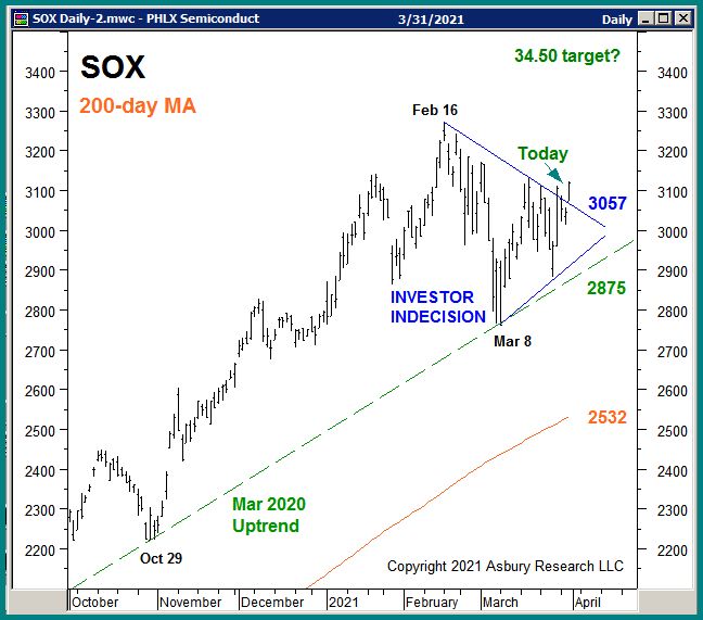 The chart shows that SOX’s March 2020 trend line was tested and held on Mar 8th. The blue highlights show that the index’s sideways, coiling price activity since then has formed a well-defined period of investor indecision on the chart.