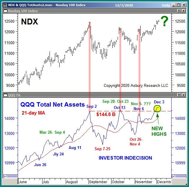 In our Dec 1st Special Report we pointed out that the total net assets invested In the SPDR S&P 500 ETF (SPY) and Invesco QQQ ETF (QQQ) were testing previous all-time highs, and said whether or not these asset levels were exceeded over the next week or so would be seen as a coincident if not leading indicator of US stock market direction through the end of the year. Three days later, the assets invested in both ETFs are making new all-time highs.
