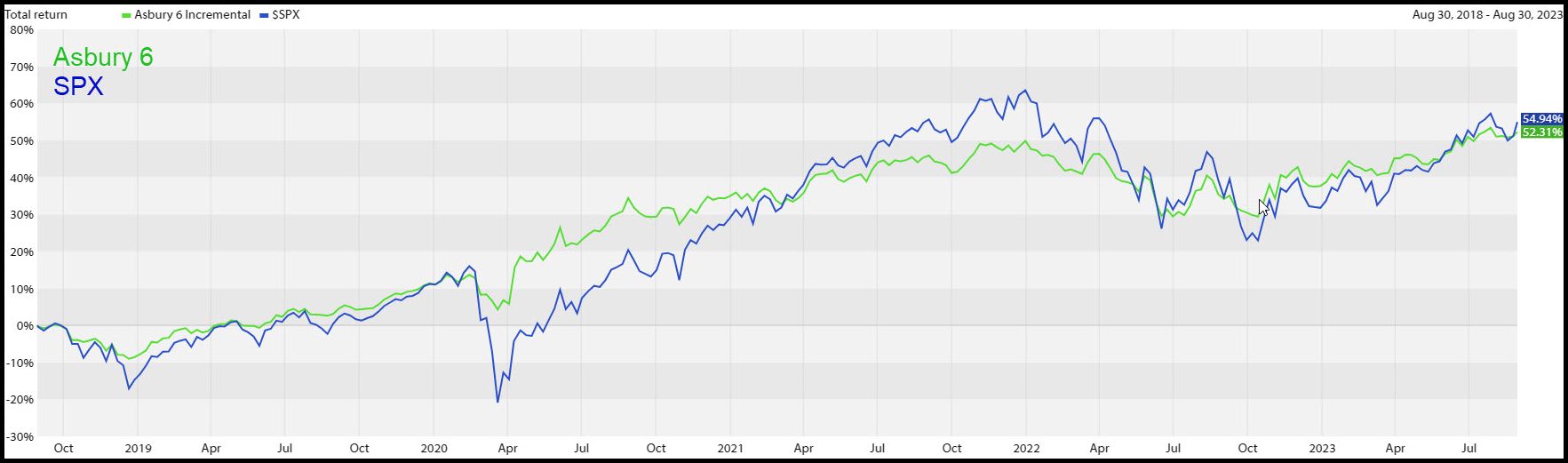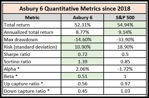 Moreover, the table below shows that the incrementally-tested Asbury 6 has essentially been a relative performer versus the S&P 500 over the past 5 years but with a maximum drawdown that was roughly half of the S&P 500, and with about half the risk according to both beta and standard deviation.