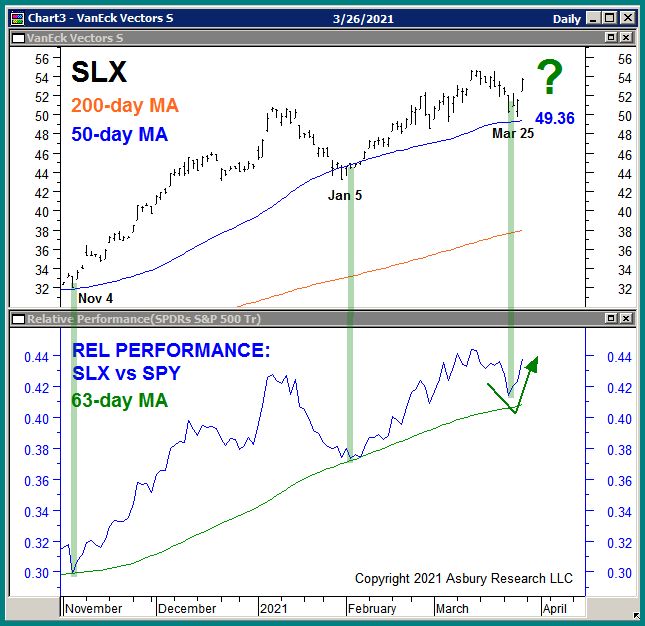 The upper panel of Chart 1 below plots SLX daily since November 2020 along with its 200- and 50-day moving averages, widely-watched major and minor trend proxies. The lower panel displays a corresponding daily relative performance chart of SLX versus the benchmark S&P 500 (SPX, blue) along with its 63-day moving average (green, quarterly, our Strategic time period).