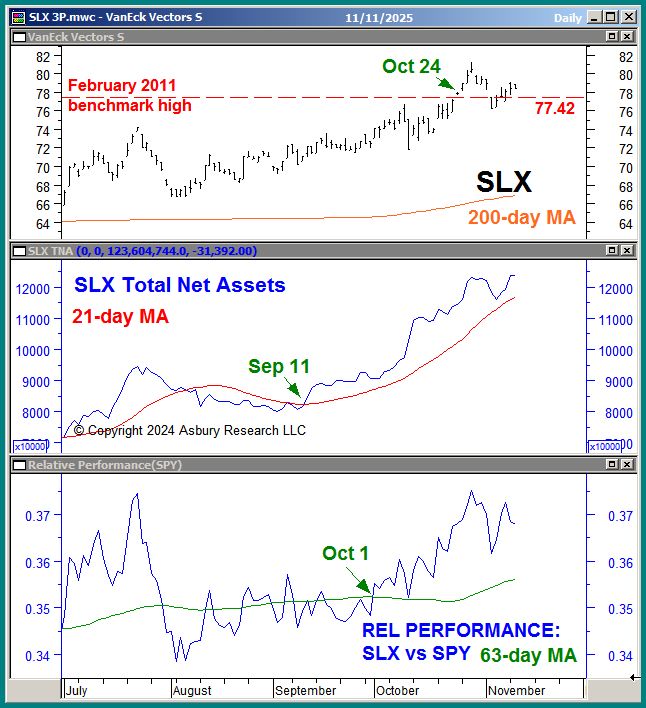 The VanEck Steel ETF (SLX) is making new 14 1/2 year highs amid monthly asset expansion and quarterly relative outperformance versus the S&P 500 (SPY). This suggests a potential new buy/overweight opportunity in SLX and other steel-related assets. (Editor’s Note: This is our second attempt since Oct 28th at entering a long position in SLX.)